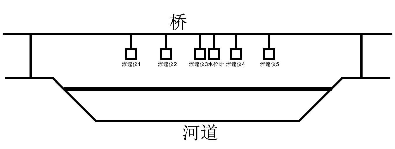 將流速儀探頭均布在橋的上方,用支架固定牢靠,調節流速儀的安裝角度,45-60°為適合的角度;雷達水位計放置在橋梁中間并用支架固定,多臺流速儀和水位計通過4芯電纜穿管走線至站房內,并連接至站房內的遙測終端機,遙測終端機將數據匯總上傳。(備注:橋可以用纜道代替)