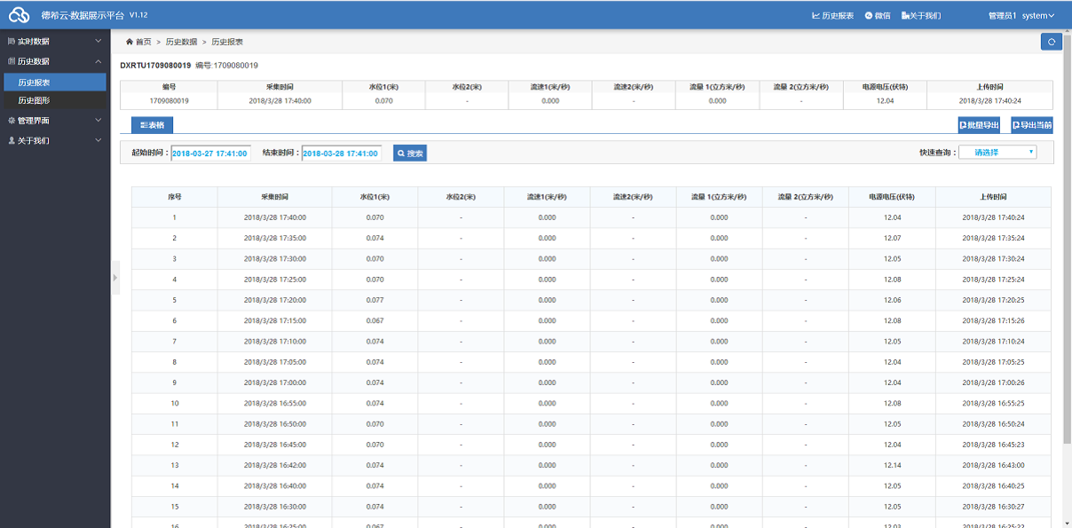 遙測終端機每5分鐘(可根據情況設定)采集底層傳感器的數據,并將其發送至相應的服務器,通過數據查看平臺可以實現實時數據的查看、歷史報表、歷史圖形、導出excle等。