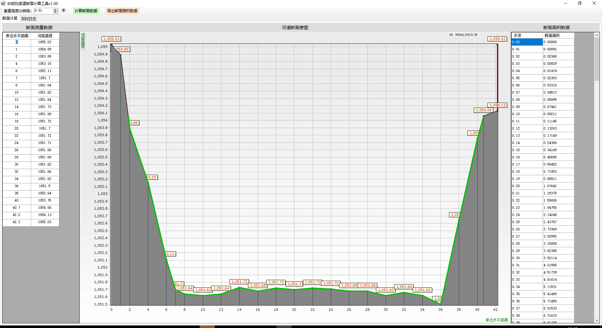 該軟件的功能是可以通過(guò)輸出斷面的橫坐標(biāo)和縱坐標(biāo)生產(chǎn)斷面形狀曲線,并且能夠自動(dòng)的生成水位和過(guò)流面積的對(duì)應(yīng)關(guān)系。用戶只需要對(duì)斷面使用時(shí)進(jìn)行一次測(cè)繪即可得到水位和過(guò)流面積對(duì)應(yīng)表。